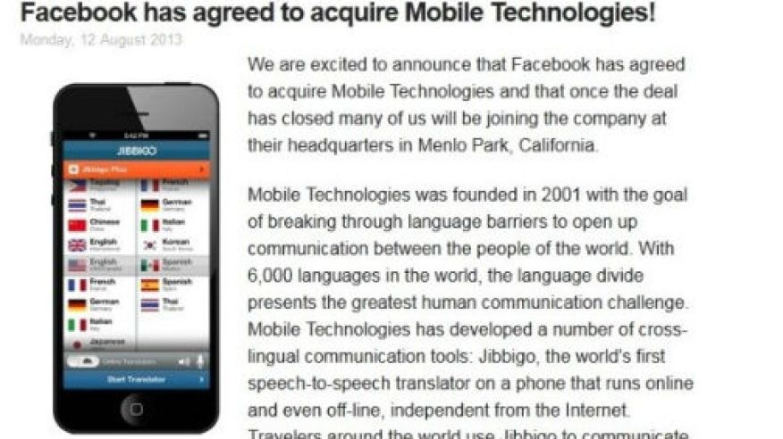 Facebook anunció la adquisición de MobileTechnologies, una empresa especializada en la interpretación de audio y trabajos de traducción. Los detalles de la operación no han sido revelados.